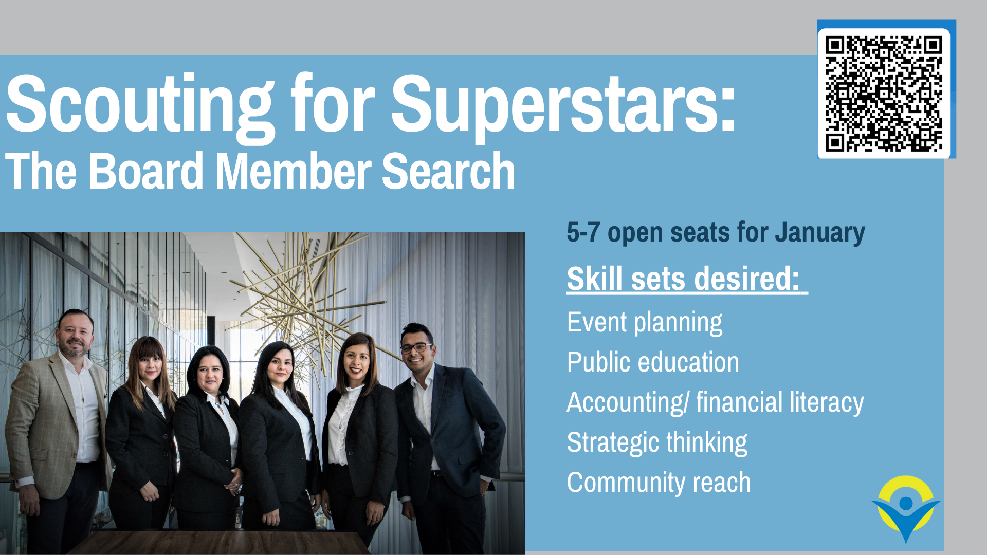 Currently, we are in search of a few prevention champions. See the skill sets we are searching for and use the QR code or click the button below to share a potential board member with us.